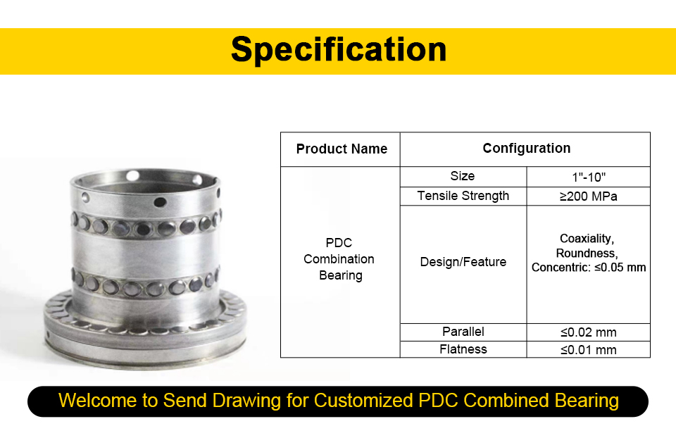 U nekim aplikacijama može biti potrebno da ležajevi izdrže i potisak i radijalna opterećenja. PDC kombinovani ležajevi kombinuju PCD potisne ležajeve i PCD radijalne ležajeve u jednu jedinicu ležaja. Sklopovi ležaja mogu se kompaktnije integrirati kako bi zadovoljili zahtjeve opterećenja i mogu se podesiti podešavanjem ugla konusa kako bi se zadovoljili zahtjevi potisnog i radijalnog opterećenja različitih primjena.