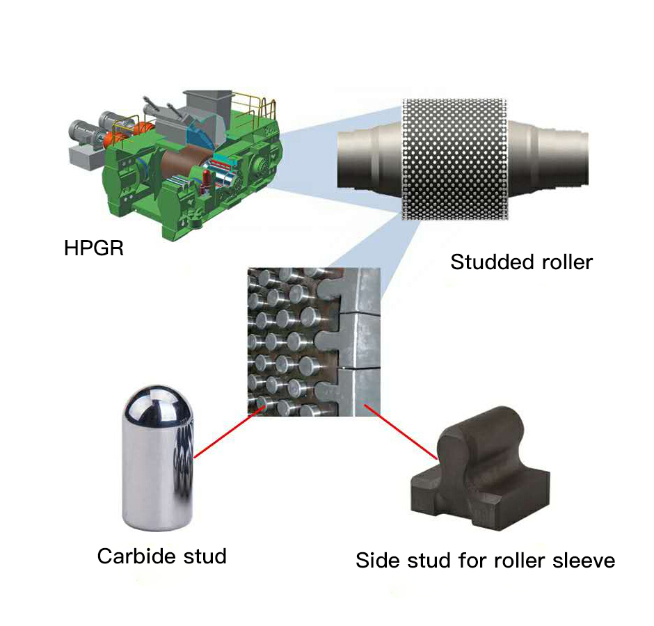 HPGR은 두 개의 역회전하는 평행 롤러 사이에 작은 간격을 두고 공급물을 압축 및 파쇄하여 입자를 줄이는 데 사용되는 에너지 효율적인 파쇄 장비입니다. HPGR은 시멘트 클링커, 석회석, 보크사이트, 철광석 연삭에 널리 사용됩니다. 텅스텐 카바이드 HPGR 스터드는 고압 연삭 롤러에 설치되어 해당 석재 또는 광석을 연삭하는 마모 롤러 표면으로 사용됩니다.