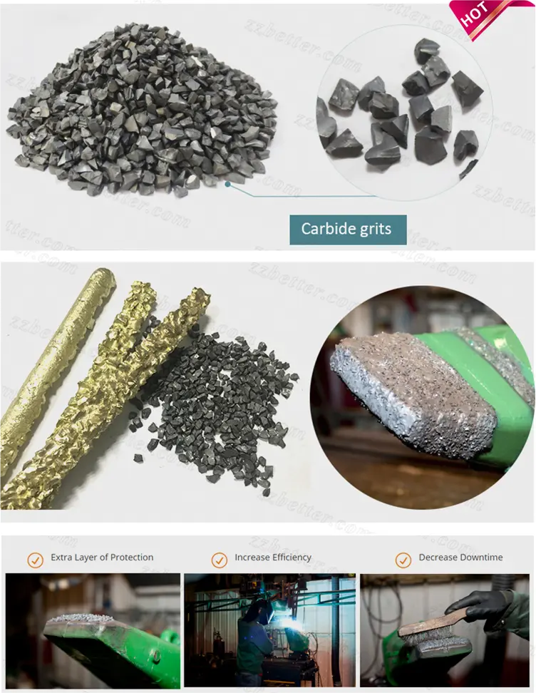 Tungsten carbide grit provides long lasting wear protection in areas of high abrasive wear. It is used to protect costly parts such as bulldozer blades, bucket teeth, wood grinding hammers, trencher teeth, and a wide variety of other consumable components. Tungsten Carbide grit is an efficient means of protecting machinery and machinery parts by providing a significant increase in the longevity of those parts. This decreases downtime and reduces the cost involved with unprotected parts.