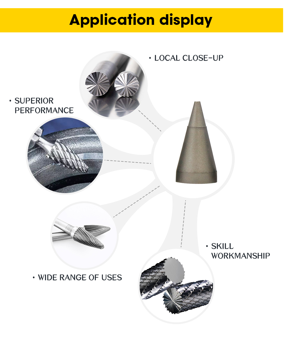 Toy ny chamfering amin'ny faritra mekanika, fanodinana sy fanodinana fantsona, fanadiovana ny sisiny manidina, burrs sy welds amin'ny fanariana, forging sy welds, ary fanodinana malefaka ny fantsona sy ny impellers. Ny tungstène carbide rotary burrs dia azo ampiasaina amin'ny zavakanto sy asa tanana sokitra metaly sy fitaovana tsy metaly (taolana, jade, vato).