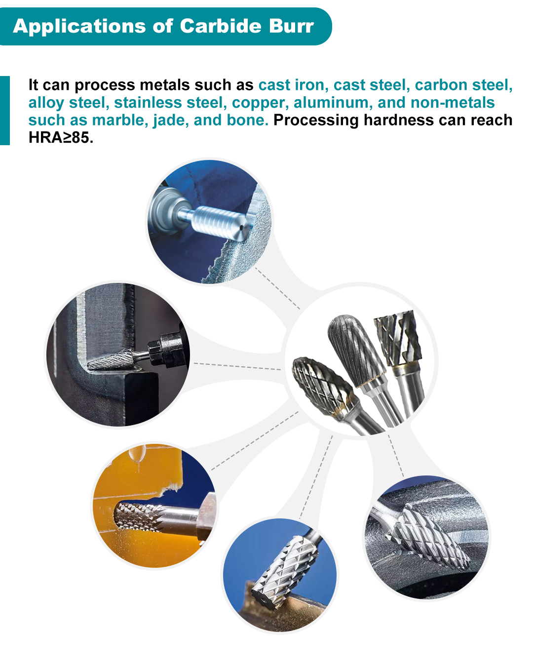 Volframkarbid roterende filer, også kjent som høyhastighets assorterte freser av hardmetall, og freser av hardmetallform, brukes sammen med høyhastighets elektriske kverner eller pneumatiske verktøy.
