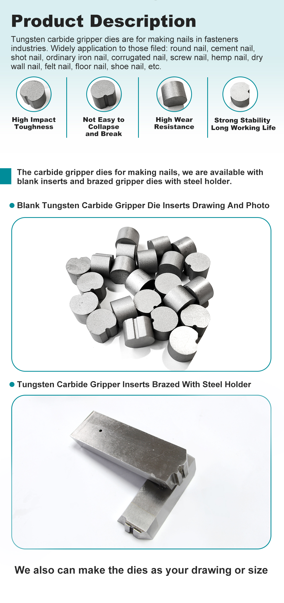 - The Tungsten carbide gripper dies is for making nails in fasteners industries. Widely application to thoses fileds: Round nail, cement nail, shot nail, ordinary iron nail, corrugated nail, screw nail,