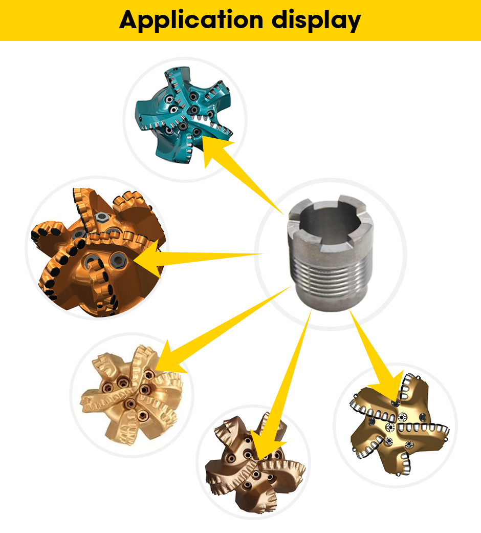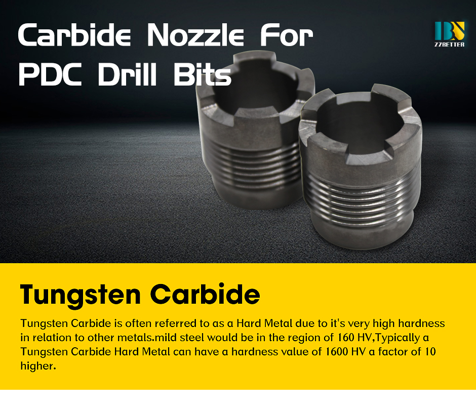 Šoba iz karbidne trdine je ena od pomembnih komponent diamantnega svedra, šoba za svedre iz volframovega karbida se uporablja za splakovanje, hlajenje in mazanje konic svedrov, šobe iz karbidne trdine lahko tudi očistijo ostružke kamnov na dnu vrtine s tekočino za vrtanje v delovnih pogojih visokega tlaka, vibracij, vpliva peska in gnojevke med iskanjem nafte in zemeljskega plina. Karbidne šobe imajo tudi hidravlični učinek drobljenja kamnin. Konvencionalna šoba je cilindrična; lahko povzroči uravnoteženo porazdelitev tlaka na površini kamnine.